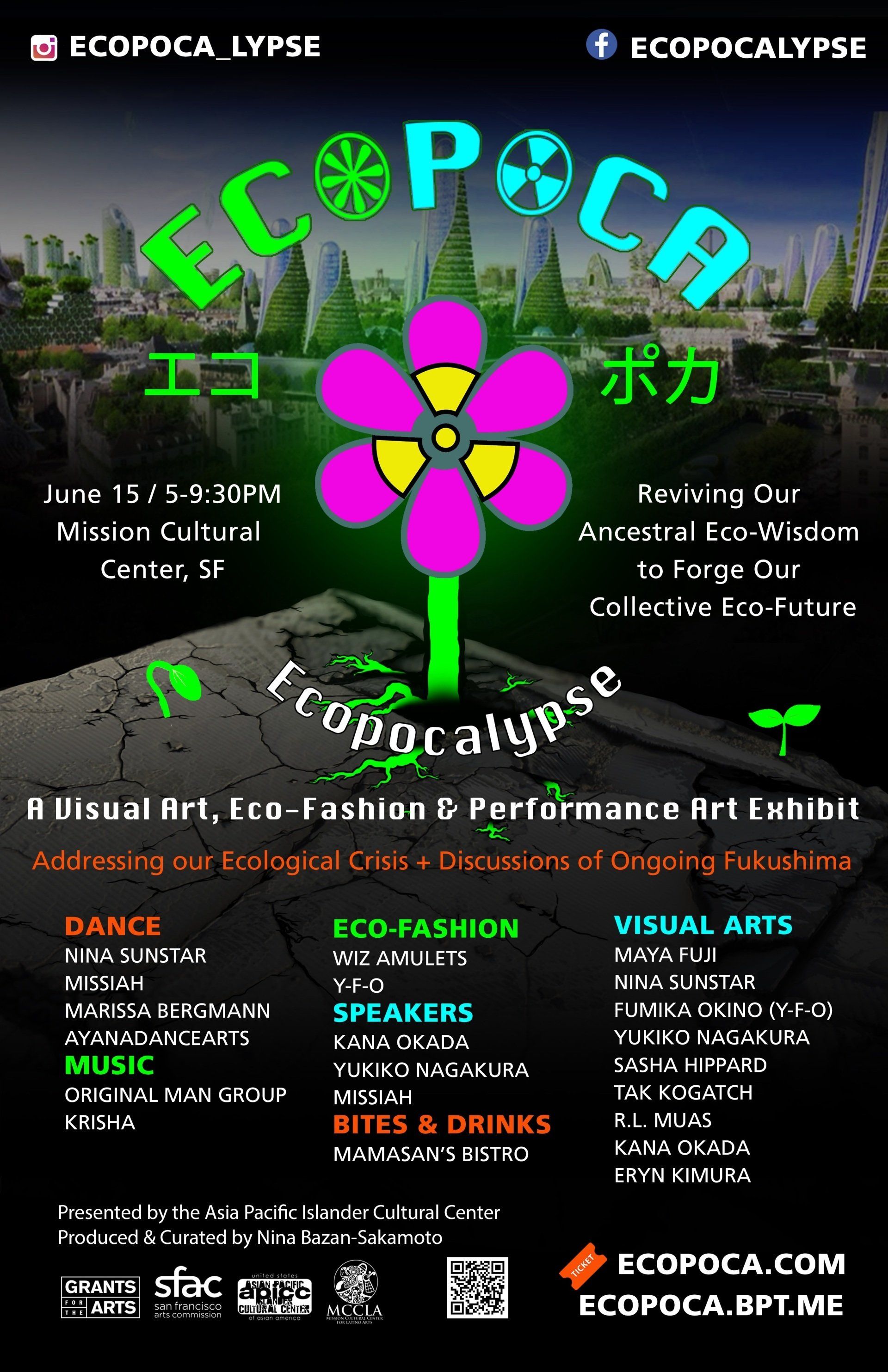 ECOPOCA is an immersive visual art, eco-fashion, & performance art exhibit + panel discussion creating a “Ku-kan,” space to experience an intersection of two alternate realities; a nuclear apocalypse, vs an advanced eco-future. A catharsis to transmute our global crisis to envision and co-create a new reality by collectively remembering & celebrating our ancestral eco-wisdom.