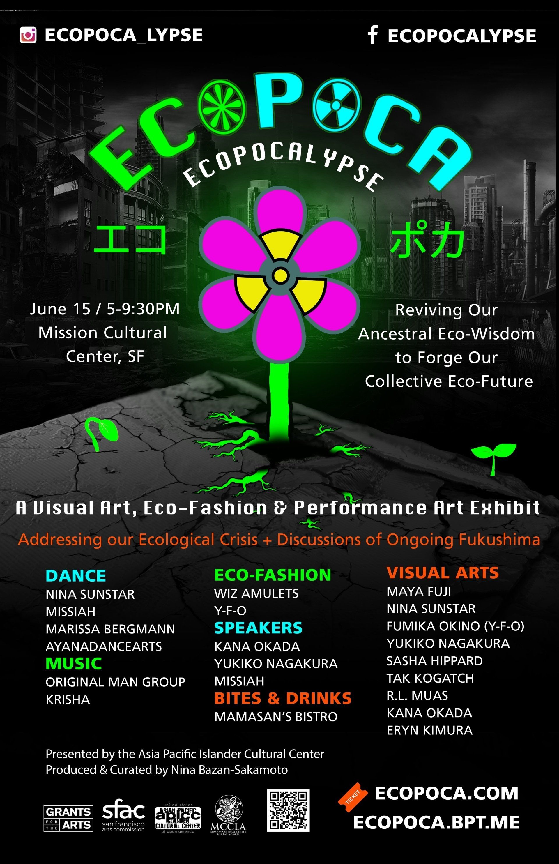 EcoPoca is a visual art, eco-fashion, and performance art exhibit that addresses environmental issues, including the ongoing Fukushima nuclear disaster, while remembering and sharing our ancestors' wisdom and connection to nature. We will be creating a “Ku-kan,” a space to experience the “in-between” - an intersection of two alternate realities possible, one of a nuclear apocalypse and one of an advanced society where nature and urban life coexist in harmony.