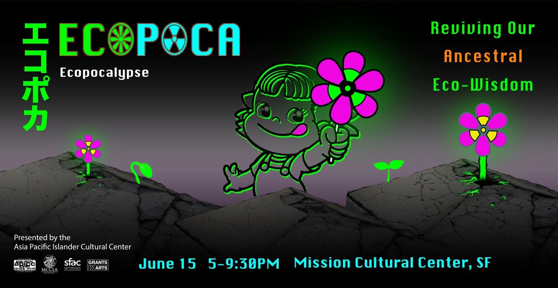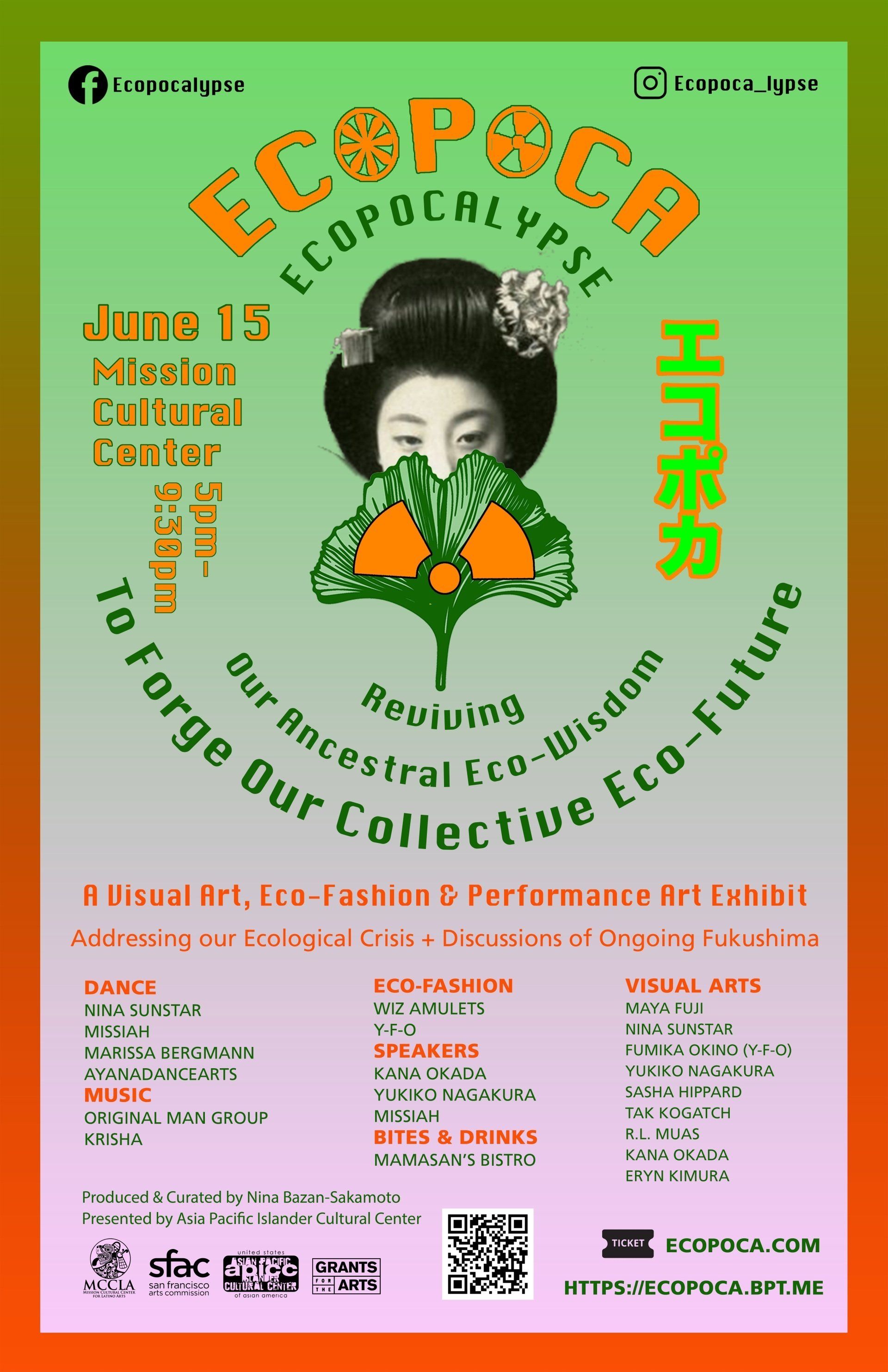 ECOPOCA is an immersive visual art, eco-fashion, & performance art exhibit + panel discussion creating a “Ku-kan,” space to experience an intersection of two alternate realities; a nuclear apocalypse, vs an advanced eco-future. A catharsis to transmute our global crisis to envision and co-create a new reality by collectively remembering & celebrating our ancestral eco-wisdom.